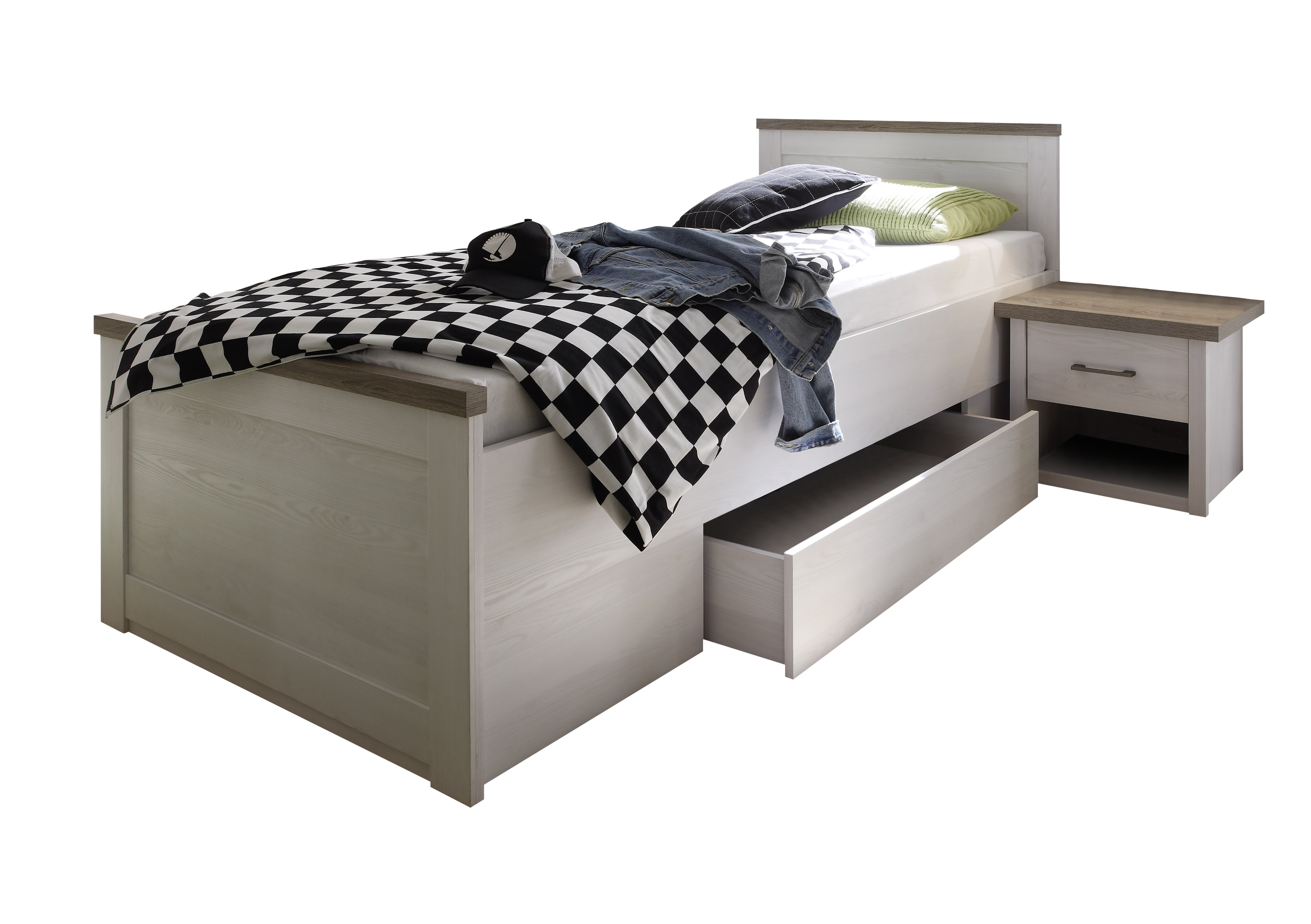 Bett,Liegefläche ca. 90 x 200 Schubkasten Farbe Pinie Weiß/Trüffel Nachbildung Abmessung montiert B/H/T ca. 96 x 58-90 x 205 cm
